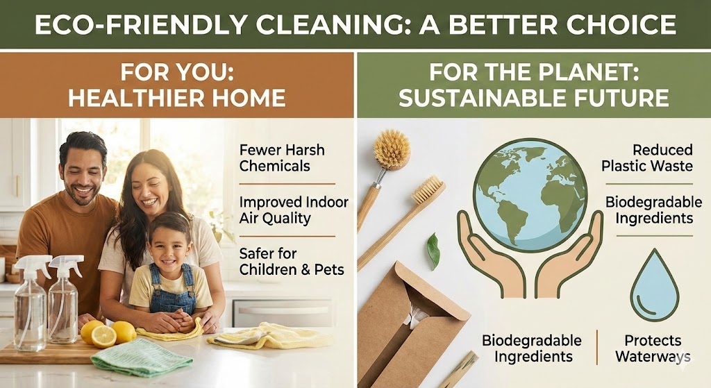 In today’s world, more people are searching for safer, healthier, and more sustainable ways to care for their homes. Traditional cleaning products may seem effective, but many contain harsh chemicals that can pollute the environment and harm human health over time. Eco-friendly cleaning offers a better alternative—one that protects your family, your home, and the